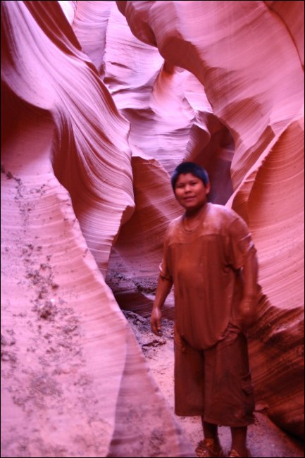 Two days before my visit, there was a storm and the rain formed a river which flowed through both canyons. The north one being wide, there was no damage, but due to the difference of shape, the south one was partly flooded and to open the canyon to the visitors, the indian familly in charge had to clean the mud left after the passage of the water. Some of their children were still actively cleaning when I went into it...