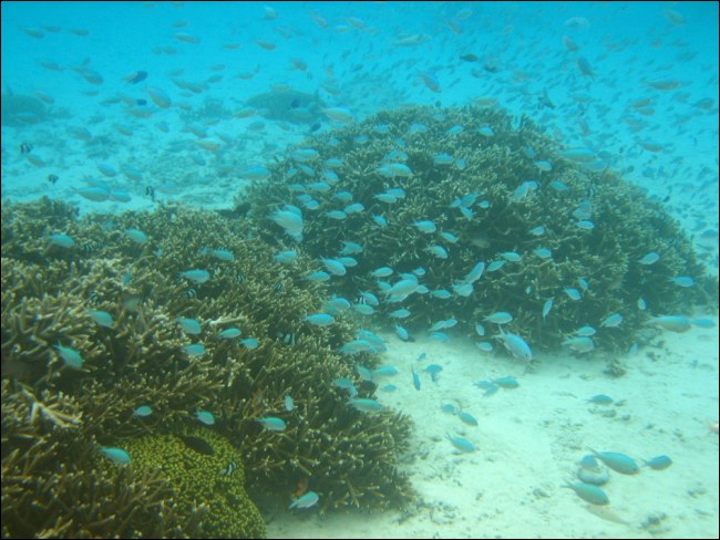 Ces petits poissons bleus se refugient dans le corail et sortent tous d'un seul coup, tel des nuees d'oiseaux