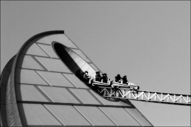 Le parcours est trace de telle sorte qu'il passe a travers un batiment et au centre d'une grande roue (elle aussi speciale puisqu'elle n'a pas de moyeu)